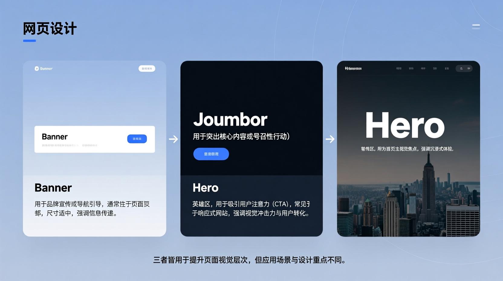 在网页设计和开发中,bannerjumbotronhero 这些词通常指代页面顶部最引人注目的区域,但它们在具体含义和使用场景上有所区别。